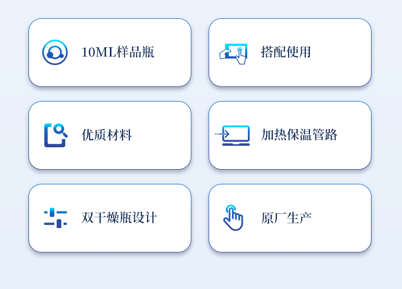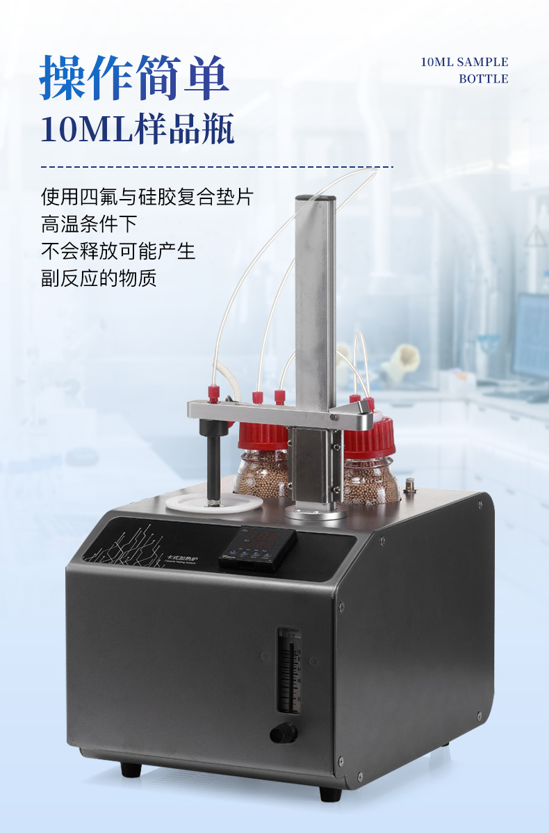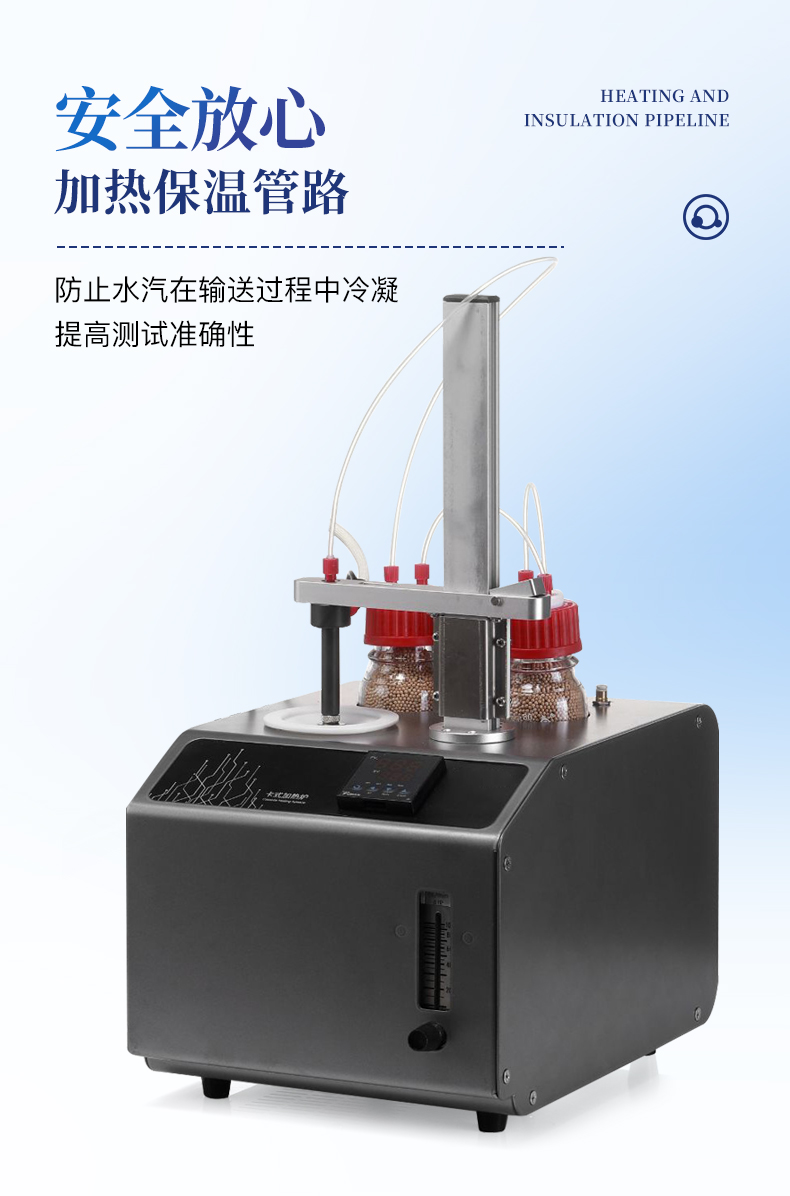 | 1、10ml樣品瓶:使用四氟與硅膠復合墊片,高溫條件下不會釋放可能產(chǎn)生副反應的物質(zhì) | 2、雙干燥瓶設(shè)計,有效降低氣源中的水分干擾 | 3、加熱保溫管路,防止水汽在輸送過程中冷凝,提高測試準確性 |