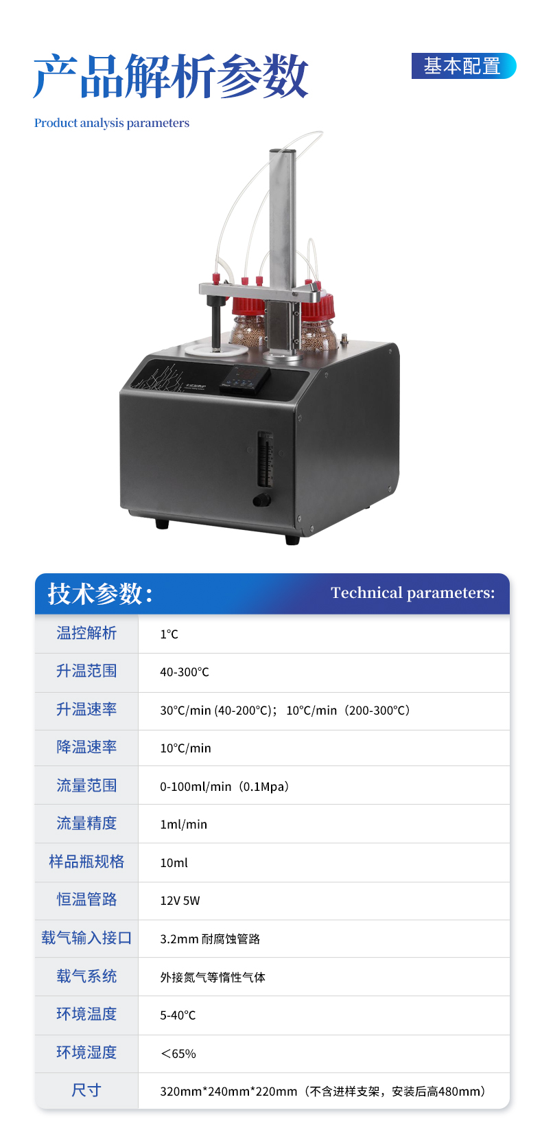 | 型號:YT-KSL | 溫控解析:1℃ | 升溫范圍:40-300℃ | 升溫速率:30℃/min (40-200℃); 10℃/min(200-300℃) | 降溫速率:10℃/min | 流量范圍:0-100ml/min(0.1Mpa) | 流量精度:1ml/min | 樣品瓶規(guī)格:10ml | 恒溫管路:12V 5W | 載氣輸入接口:3.2mm 耐腐蝕管路 | 載氣系統(tǒng):外接氮氣等惰性氣體 | 環(huán)境溫度:5-40℃ | 環(huán)境濕度:<65% | 尺寸:320mm*240mm*220mm(不含進樣支架,安裝后高480mm) |