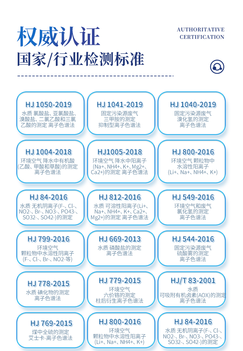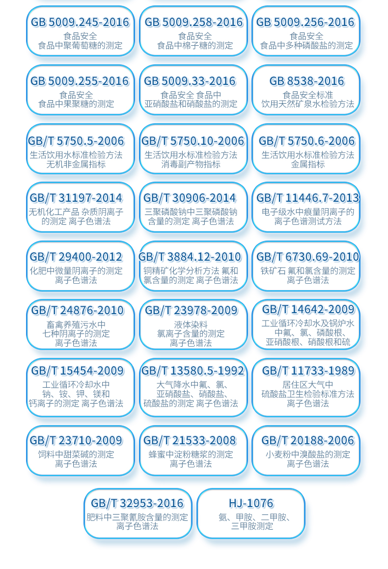 | HJ 1050-2019 水質(zhì) 氯酸鹽、亞氯酸鹽、溴酸鹽、二氯乙酸和三氯乙酸的測定 離子色譜法 | HJ 1041-2019 固定污染源廢氣 三甲胺的測定 抑制型離子色譜法 | HJ 1040-2019 固定污染源廢氣 溴化氫的測定 離子色譜法 | HJ 1004-2018 環(huán)境空氣 降水中有機(jī)酸(乙酸、甲酸和草酸)的測定 離子色譜法 | HJ1005-2018 環(huán)境空氣 降水中陽離子(Na+、NH4+、K+、Mg2+、Ca2+)的測定 離子色譜法 | HJ 800-2016 環(huán)境空氣 顆粒物中水溶性陽離子(Li+、Na+、NH4+、K+) | HJ 84-2016 水質(zhì) 無機(jī)陰離子(F-、Cl-、NO2-、Br-、NO3-、PO43-、SO32-、SO42-)的測定 | HJ 812-2016 水質(zhì) 可溶性陽離子(Li+、Na+、NH4+、K+、Ca2+、Mg2+)的測定 離子色譜法 | HJ 549-2016 環(huán)境空氣和廢氣 氯化氫的測定 離子色譜法 | HJ 799-2016 環(huán)境空氣 顆粒物中水溶性陰離子(F-、Cl-、Br-、NO2-等) | HJ 669-2013 水質(zhì) 磷酸鹽的測定 離子色譜法 | HJ 544-2016 固定污染源廢氣 硫酸霧的測定 離子色譜法 | HJ 778-2015 水質(zhì) 碘化物的測定 離子色譜法 | HJ 779-2015 環(huán)境空氣 六價(jià)鉻的測定 柱后衍生離子色譜法 | HJ/T 83-2001 水質(zhì) 可吸附有機(jī)鹵素(AOX)的測定 離子色譜法 | HJ 769-2015 煤中全硫的測定 艾士卡-離子色譜法 | HJ 800-2016 環(huán)境空氣 顆粒物中水溶性陽離子(Li+、Na+、NH4+、K+) | HJ 84-2016 水質(zhì) 無機(jī)陰離子(F-、Cl-、NO2-、Br-、NO3-、PO43-、SO32-、SO42-)的測定 | GB 5009.245-2016 食品安全 食品中聚葡萄糖的測定 | GB 5009.258-2016 食品安全 食品中棉子糖的測定 | GB 5009.256-2016 食品安全 食品中多種磷酸鹽的測定 | GB 5009.255-2016 食品安全 食品中果聚糖的測定 | GB 5009.33-2016 食品安全 食品中亞硝酸鹽和硝酸鹽的測定 | GB 8538-2016 食品安全標(biāo)準(zhǔn) 飲用天然礦泉水檢驗(yàn)方法 | GB/T 5750.5-2006 生活飲用水標(biāo)準(zhǔn)檢驗(yàn)方法 無機(jī)非金屬指標(biāo) | GB/T 5750.10-2006 生活飲用水標(biāo)準(zhǔn)檢驗(yàn)方法 消毒副產(chǎn)物指標(biāo) | GB/T 5750.6-2006 生活飲用水標(biāo)準(zhǔn)檢驗(yàn)方法 金屬指標(biāo) | GB/T 31197-2014 無機(jī)化工產(chǎn)品 雜質(zhì)陰離子的測定 離子色譜法 | GB/T 30906-2014 三聚磷酸鈉中三聚磷酸鈉含量的測定 離子色譜法 | GB/T 11446.7-2013 電子級水中痕量陰離子的離子色譜測試方法 | GB/T 29400-2012 化肥中微量陰離子的測定 離子色譜法 | GB/T 3884.12-2010 銅精礦化學(xué)分析方法 第12部分:氟和氯含量的測定 離子色譜法 | GB/T 6730.69-2010 鐵礦石 氟和氯含量的測定 離子色譜法 | GB/T 24876-2010 畜禽養(yǎng)殖污水中七種陰離子的測定 離子色譜法 | GB/T 23978-2009 液體染料 氯離子含量的測定 離子色譜法 | GB/T 14642-2009 工業(yè)循環(huán)冷卻水及鍋爐水中氟、氯、磷酸根、亞硝酸根、硝酸根和硫 | GB/T 15454-2009 工業(yè)循環(huán)冷卻水中鈉、銨、鉀、鎂和鈣離子的測定 離子色譜法 | GB/T 23710-2009 飼料中甜菜堿的測定 離子色譜法 | GB/T 21533-2008 蜂蜜中淀粉糖漿的測定 離子色譜法 | GB/T 20188-2006 小麥粉中溴酸鹽的測定 離子色譜法 | GB/T 13580.5-1992 大氣降水中氟、氯、亞硝酸鹽、硝酸鹽、硫酸鹽的測定 離子色譜法 | GB/T 32953-2016 肥料中三聚氰胺含量的測定 離子色譜法 | GB/T 11733-1989 居住區(qū)大氣中硫酸鹽衛(wèi)生檢驗(yàn)標(biāo)準(zhǔn)方法 離子色譜法 | HJ-1076 氨、甲胺、二甲胺、三甲胺測定 |