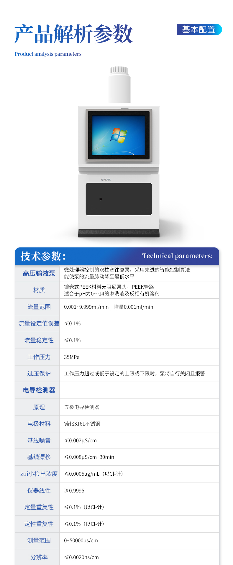 微處理器控制的雙柱塞往復(fù)泵,采用**的智能控制算法,能使泵的流量脈動降至**水平。 1.1,材質(zhì):鑲嵌式PEEK材料無阻尼泵頭,PEEK管路,適合于pH為0~14的淋洗液及反相有機(jī)溶劑。 1.2,流量范圍:0.001~9.999ml/min,增量0.001ml/min。 1.3,流量設(shè)定值誤差:≤0.1% 1.4,流量穩(wěn)定性:≤0.1% 1.5,工作壓力:35MPa 1.6,過壓保護(hù):工作壓力超過或低于設(shè)定的上限或下限時(shí),泵將自行關(guān)閉且報(bào)警。 | 2 電導(dǎo)檢測器: 2.1,原理:五極電導(dǎo)檢測器 2.2,電極材料:鈍化316L不銹鋼 2.3,基線噪音:≤0.002μS/cm 2.4,基線漂移:≤0.008μS/cm·30min 2.5,zui小檢出濃度:≤0.0005ug/mL(以Cl-計(jì)) 2.6,儀器線性:≥0.9995 2.7,定量重復(fù)性:≤0.1%(以Cl-計(jì)) 2.8,定性重復(fù)性:≤0.1%(以Cl-計(jì)) 2.9,測量范圍:0~50000us/cm 2.10,分辨率:≤0.0020ns/cm 2.11,檢測池體積:0.8uL 2.12,操作壓力:≤10Mpa。 2.13,電導(dǎo)檢測量程: 0-50000uS,10檔可調(diào)。 | 3、 陰、陽離子抑制器: 3.1連續(xù)自動再生電化學(xué)微膜抑制器,在線自動再生,高抑制容量,低背景電導(dǎo),低噪聲,基線穩(wěn)定,免維護(hù)。 3.2抗污染,耐壓好,壽命長,使用范圍廣(PH0-14)。 3.3體積小,穩(wěn)定時(shí)間快,穩(wěn)定時(shí)間不大于12分鐘,且重現(xiàn)性好。 | 4 流路系統(tǒng): 4.1流路系統(tǒng)使用PEEK材料制造,通用性好,能使用強(qiáng)酸、強(qiáng)堿的淋洗液。 4.2百分之百的有機(jī)溶劑兼容,方便用戶對復(fù)雜樣品進(jìn)行分析、沖洗和維護(hù)。 4.3 結(jié)構(gòu)緊湊,流路*短,對流路造成的峰型擴(kuò)展有很好的改善。 4.4 內(nèi)置多處漏液報(bào)警器和缺水報(bào)警器,全方位安全監(jiān)控。 | 5 內(nèi)置色譜工作站: 5.1 24位高精度高靈敏度數(shù)模轉(zhuǎn)換。 5.2專用離子色譜工作站,全中文顯示,通過USB方式與電腦進(jìn)行數(shù)字信號傳輸,完成色譜數(shù)據(jù)采集及處理。 5.3自動接收分析和控制保存儀器色譜條件。 5.4自動識別負(fù)峰、基線扣除功能。自動積分參數(shù)、自動生成報(bào)告。 | 6 色譜柱、抑制器、電導(dǎo)池、放大電路一體恒溫系統(tǒng): 將電導(dǎo)池、流路系統(tǒng)、分離柱、抑制器、放大電路恒溫在同一個控溫基體上置于柱箱內(nèi),恒溫精度5~65℃±0.01℃。并且儀器柱箱采用絕熱結(jié)構(gòu),可保持檢測系統(tǒng)、流路及柱子、抑制器、電導(dǎo)池、放大電路的溫度恒定,獲得高質(zhì)量的分離效果和檢測精度,改善了電導(dǎo)檢測器的溫飄和基線噪聲。 | 7內(nèi)置淋洗液發(fā)生器,僅用高純水,無需人工配制任何化學(xué)試劑,在線產(chǎn)生等度或梯度高純淋洗液,減少基線漂移,提高穩(wěn)定性,簡化工作流程。 | 8 在線自動脫氣系統(tǒng): 1,脫氣效率:在25℃入口流動相的含氧量為8PPM時(shí),出口流動相的含氧量為2PPM (流速:1.5mlmin) 2,真空壓力:-0.018MPa 3,流量:5mL/min | 9 分離能力:(分別配置不同的陰、陽離子分離柱,可以分離的離子種類:) 配置國產(chǎn)陰離子分離柱:一次進(jìn)樣分析:氟化物、氯化物、亞硝酸鹽、磷酸鹽、溴化物、硝酸鹽、硫酸鹽 配置進(jìn)口陰離子分離柱:一次進(jìn)樣分析:氟化物、溴酸鹽、氯化物、亞硝酸鹽、磷酸鹽、溴化物、硝酸鹽、硫酸鹽、亞氯酸鹽、高氯酸鹽、二氯乙酸、三氯乙酸等 配置進(jìn)口陽離子分離柱:一次進(jìn)樣分析::Li+、Na+、NH4+、K+、Ca2+、Mg2+、Sr2+、Ba2+等 | 10 重量:30kg左右 尺寸mm:長500,寬400,高600 |