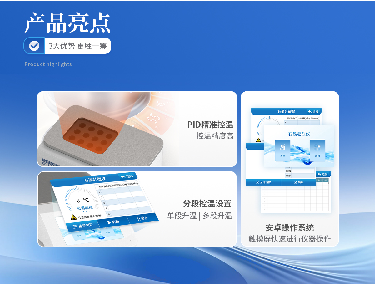 使用5寸彩色觸摸屏進(jìn)行儀器操作,配備安卓操作系統(tǒng),方便快捷。 | 采用PID 控溫技術(shù),控溫精度高,升溫速度快, 從室溫到260℃僅需25分鐘。 | 分段控溫設(shè)置,即可單段升溫,也可多段升溫,設(shè)置靈活,儀器將自動(dòng)按順序完成。更適于易產(chǎn)生泡沫的樣品。 | 采用優(yōu)質(zhì)石墨爐內(nèi)芯,平均溫差較小,樣品效果一致性好,熱傳導(dǎo)效率更高。石墨塊具有特氟龍涂層,耐腐蝕,延長(zhǎng)使用壽命。 |