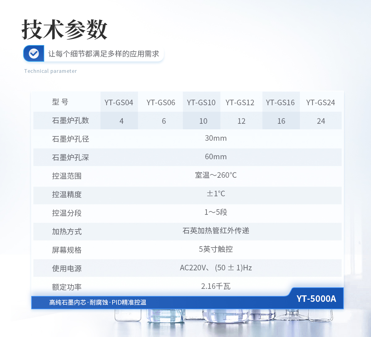 石墨爐孔:孔徑30mm,孔深60mm,孔數(shù)2×2 | 控溫范圍:室溫~260℃ | 控溫精度:±1℃ | 控溫分段:1~5段 | 加熱方式:石英加熱管紅外傳遞 | 屏幕規(guī)格:5寸觸控 | 主機(jī)外型尺寸:寬387mm×深371mm×高168mm | 使用電源:AC220V、 (50 ± 1)Hz | 額定功率:1千瓦 |