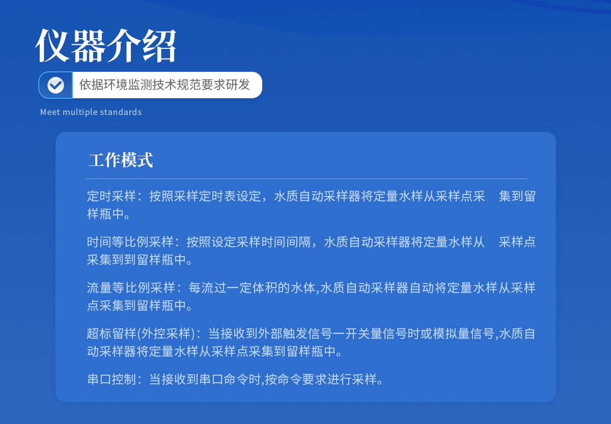 | 1.定時(shí)采樣:按照采樣定時(shí)表設(shè)定,水質(zhì)自動(dòng)采樣器將定量水樣從采樣點(diǎn)采 集到留樣瓶中。 | 2.時(shí)間等比例采樣:按照設(shè)定采樣時(shí)間間隔,水質(zhì)自動(dòng)采樣器將定量水樣從 采樣點(diǎn)采集到到留樣瓶中。 | 3.流量等比例采樣:每流過(guò)一定體積的水體,水質(zhì)自動(dòng)采樣器自動(dòng)將定量水樣從采樣點(diǎn)采集到留樣瓶中。 | 4.超標(biāo)留樣(外控采樣):當(dāng)接收到外部觸發(fā)信號(hào)一開關(guān)量信號(hào)時(shí)或模擬量信號(hào),水質(zhì)自動(dòng)采樣器將定量水樣從采樣點(diǎn)采集到留樣瓶中。 | 5.串口控制:當(dāng)接收到串口命令時(shí),按命令要求進(jìn)行采樣。 |