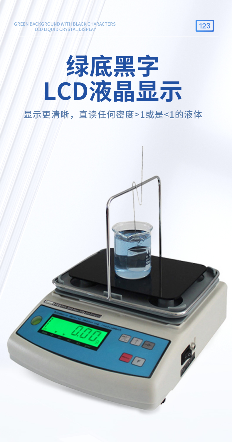 | 1、進(jìn)入液體密度測試模式后,狀態(tài)顯示區(qū)顯示“AIR”。 將掛鉤懸掛在液體專用架正中央,按下“清零”鍵,扣除掛鉤重量。 | 2、使用掛鉤將標(biāo)準(zhǔn)的玻璃砝碼鉤起,穩(wěn)定后,按“取樣”鍵。確認(rèn)玻璃砝碼在空氣中的重量時(shí),顯示“SAV-A”,表示已記錄空氣中的重量值。 | 3、此時(shí)狀態(tài)顯示區(qū)顯示“LIq”。取下玻璃砝碼。并取50ml待測液體樣品到燒杯中,將玻璃砝碼放入液體中。 | 4、將燒杯放在支撐板的正中央,使用掛鉤將玻璃砝碼鉤起(確定測量液體有高于玻璃砝碼,而且玻璃砝碼不可以碰到燒杯壁),穩(wěn)定后,按“取樣”鍵。確認(rèn)玻璃砝碼在液體中的重量時(shí),顯示“SAV-B”,表示已記錄液體中的重量值。 | 5、自動顯示被測液體的密度值。按“模式”鍵,可切換顯示樣品的濃度值。 | 7、按“設(shè)置”鍵返回到待測狀態(tài),可進(jìn)行下一組樣品的測量。(連續(xù)測試時(shí),要將掛鉤及玻璃砝碼清潔干凈) | 儀器尺寸:195*220*190mm | 包裝尺寸:430*200*360mm | 包裝重量:4kg |