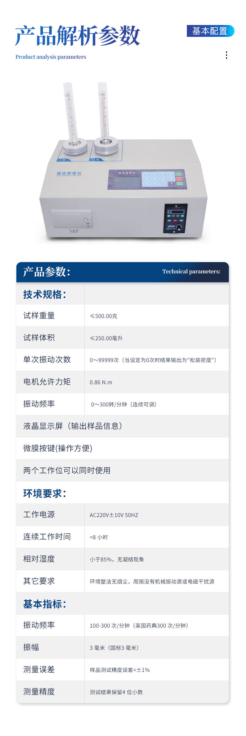 | 試樣重量:≤500.00克; | 試樣體積:≤250.00毫升; | 單次振動次數(shù):0~99999次(當(dāng)設(shè)定為0次時結(jié)果輸出為"松裝密度"); | 電機允許力矩:0.86 N.m; | 振動頻率: 0~300轉(zhuǎn)/分鐘(連續(xù)可調(diào)); | 液晶顯示屏(輸出樣品信息); | 微膜按鍵(操作方便) | 兩個工作位可以同時使用 | 振動幅度:3mm,(可調(diào)) | ZS2高精度振實密度儀是專門針對固體粉體密度的測量儀器,按照國家標(biāo)準GB/T 5162-2006/ISO3953:1993,參照美國藥典標(biāo)準研發(fā)制造。廣泛應(yīng)用于工業(yè)、電池材料、藥品材料、奶制品、磨料、造紙、水泥、涂料、科研機構(gòu)、大中專院校以及各種金屬和非金屬行業(yè)。 |