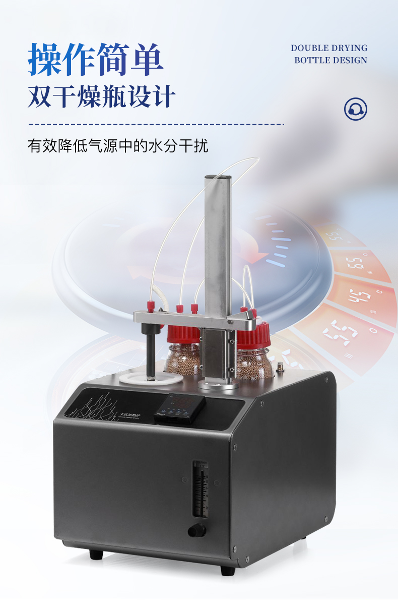 | 1、10ml樣品瓶:使用四氟與硅膠復合墊片,高溫條件下不會釋放可能產(chǎn)生副反應的物質(zhì) | 2、雙干燥瓶設(shè)計,有效降低氣源中的水分干擾 | 3、加熱保溫管路,防止水汽在輸送過程中冷凝,提高測試準確性 |