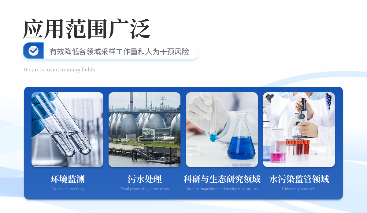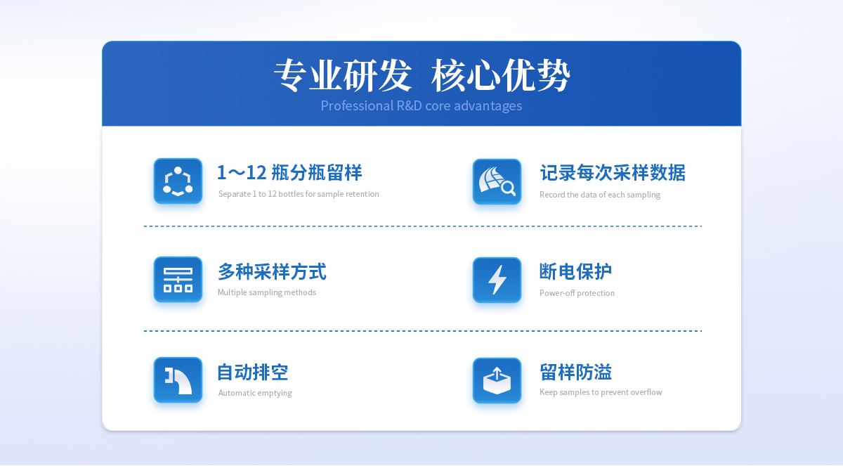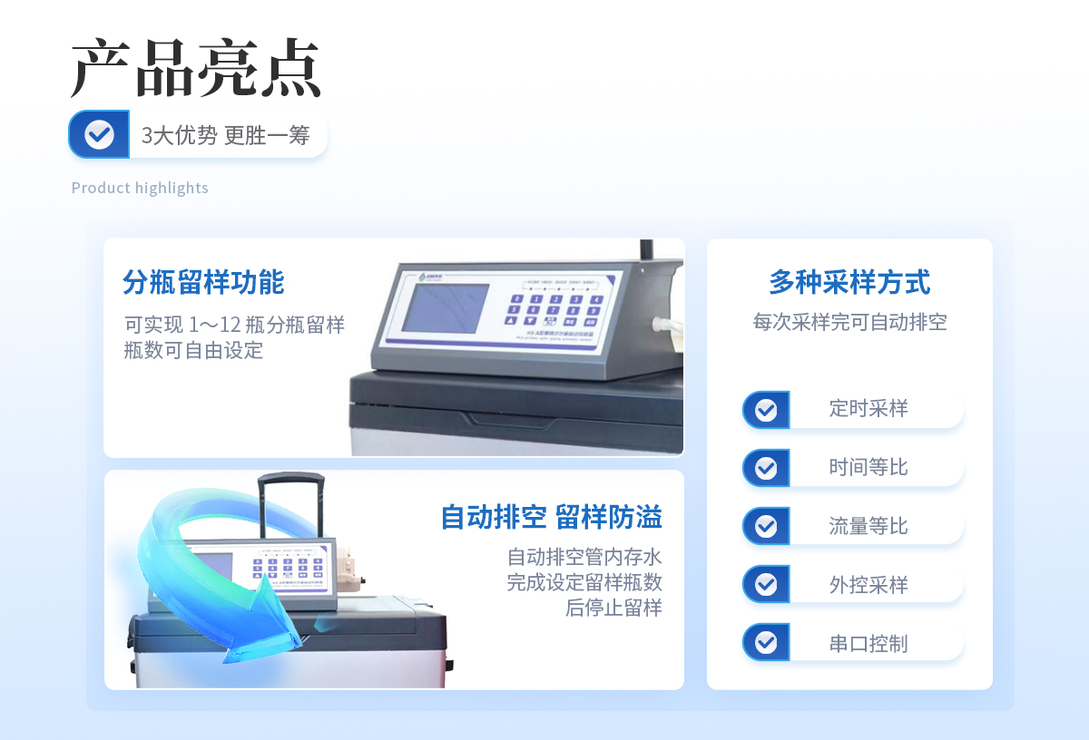 | 1.定時(shí)采樣:按照采樣定時(shí)表設(shè)定,水質(zhì)自動(dòng)采樣器將定量水樣從采樣點(diǎn)采 集到留樣瓶中。 | 2.時(shí)間等比例采樣:按照設(shè)定采樣時(shí)間間隔,水質(zhì)自動(dòng)采樣器將定量水樣從 采樣點(diǎn)采集到到留樣瓶中。 | 3.流量等比例采樣:每流過(guò)一定體積的水體,水質(zhì)自動(dòng)采樣器自動(dòng)將定量水樣從采樣點(diǎn)采集到留樣瓶中。 | 4.超標(biāo)留樣(外控采樣):當(dāng)接收到外部觸發(fā)信號(hào)一開關(guān)量信號(hào)時(shí)或模擬量信號(hào),水質(zhì)自動(dòng)采樣器將定量水樣從采樣點(diǎn)采集到留樣瓶中。 | 5.串口控制:當(dāng)接收到串口命令時(shí),按命令要求進(jìn)行采樣。 |