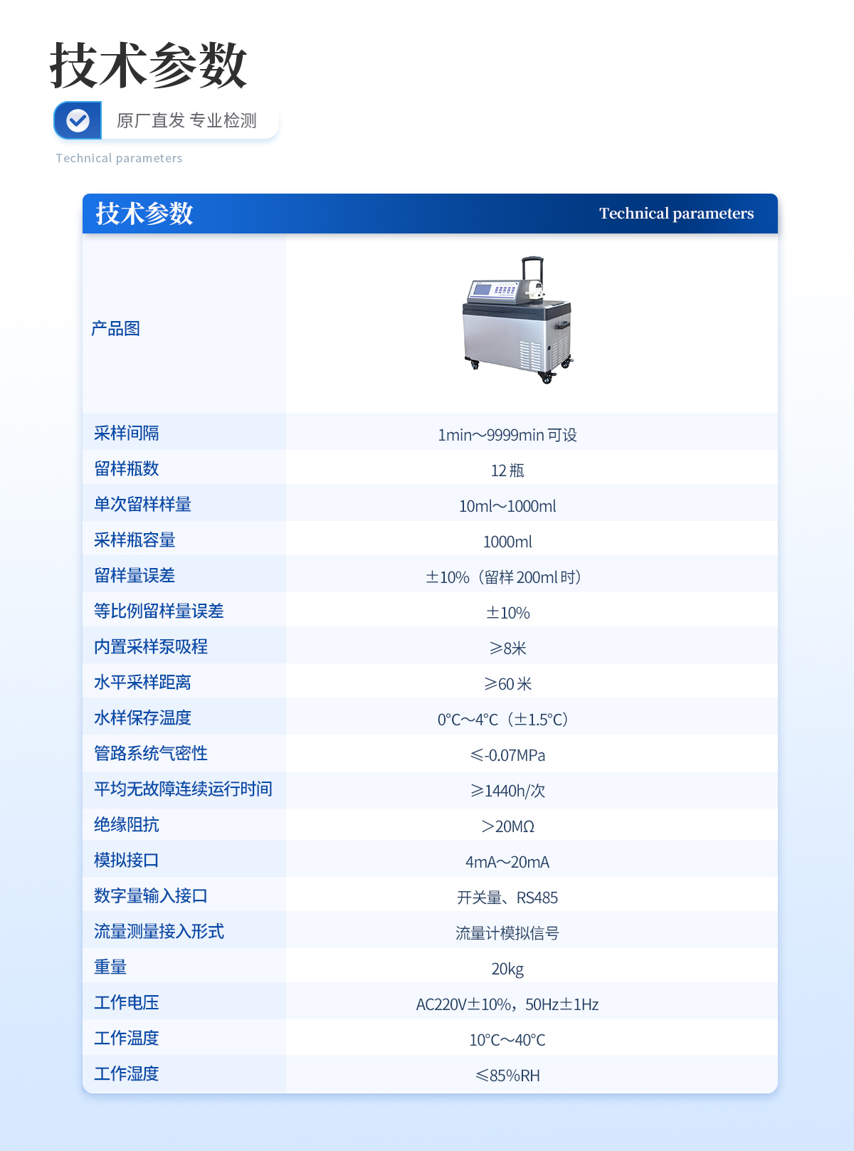 | 采樣間隔:1min~9999min 可設(shè) | 留樣瓶數(shù):12 瓶 | 單次留樣樣量:10ml~1000ml | 采樣瓶容量:1000ml | 留樣量誤差:±10%(留樣 200ml 時(shí)) | 等比例留樣量誤差:±10% | 內(nèi)置采樣泵吸程:≥8米 | 水平采樣距離:≥60 米 | 水樣保存溫度:0℃~4℃(±1.5℃) | 管路系統(tǒng)氣密性:≤-0.07MPa | 平均無(wú)故障連續(xù)運(yùn)行時(shí)間:≥1440h/次 | 絕緣阻抗:>20MΩ | 模擬接口:4mA~20mA | 數(shù)字量輸入接口:開關(guān)量、RS485 | 流量測(cè)量接入形式:流量計(jì)模擬信號(hào) | 重量:20kg | 工作電壓:AC220V±10%,50Hz±1Hz | 工作溫度:10℃~40℃ | 工作濕度:≤85%RH |