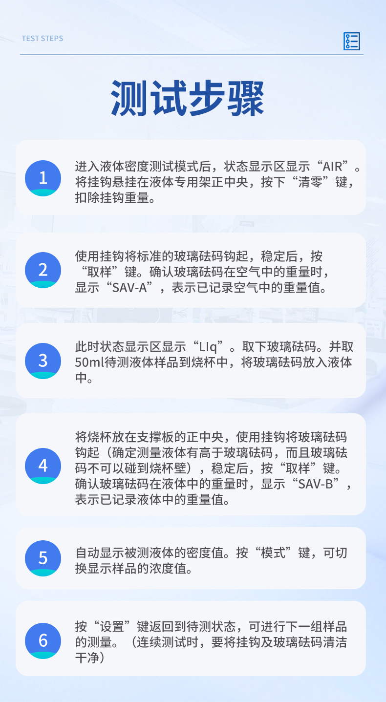| 1、進(jìn)入液體密度測試模式后,狀態(tài)顯示區(qū)顯示“AIR”。 將掛鉤懸掛在液體專用架正中央,按下“清零”鍵,扣除掛鉤重量。 | 2、使用掛鉤將標(biāo)準(zhǔn)的玻璃砝碼鉤起,穩(wěn)定后,按“取樣”鍵。確認(rèn)玻璃砝碼在空氣中的重量時(shí),顯示“SAV-A”,表示已記錄空氣中的重量值。 | 3、此時(shí)狀態(tài)顯示區(qū)顯示“LIq”。取下玻璃砝碼。并取50ml待測液體樣品到燒杯中,將玻璃砝碼放入液體中。 | 4、將燒杯放在支撐板的正中央,使用掛鉤將玻璃砝碼鉤起(確定測量液體有高于玻璃砝碼,而且玻璃砝碼不可以碰到燒杯壁),穩(wěn)定后,按“取樣”鍵。確認(rèn)玻璃砝碼在液體中的重量時(shí),顯示“SAV-B”,表示已記錄液體中的重量值。 | 5、自動顯示被測液體的密度值。按“模式”鍵,可切換顯示樣品的濃度值。 | 7、按“設(shè)置”鍵返回到待測狀態(tài),可進(jìn)行下一組樣品的測量。(連續(xù)測試時(shí),要將掛鉤及玻璃砝碼清潔干凈) | 儀器尺寸:195*220*190mm | 包裝尺寸:430*200*360mm | 包裝重量:4kg |
