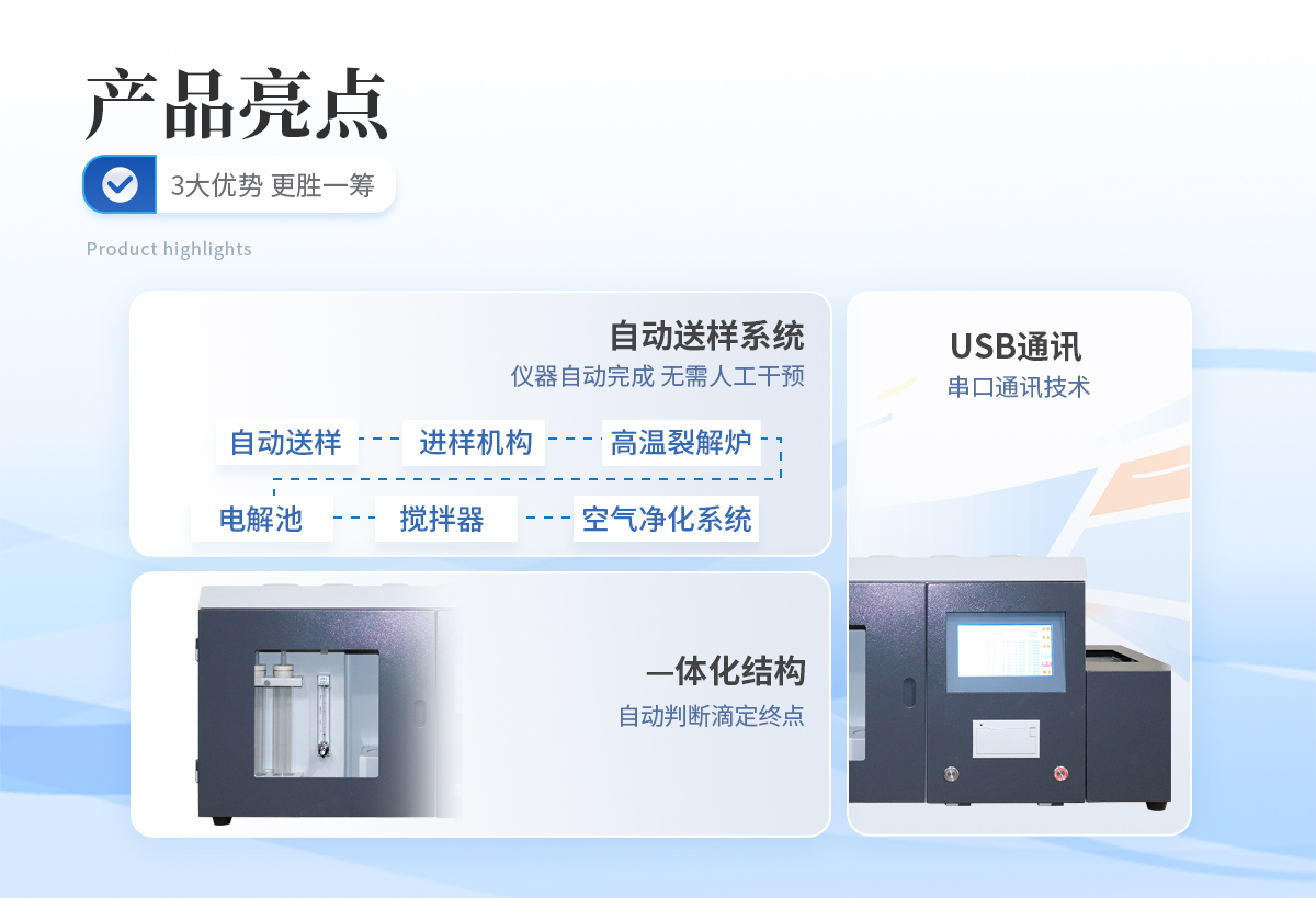 1、 手自一體化自動(dòng)送樣系統(tǒng),將自動(dòng)送樣、進(jìn)樣機(jī)構(gòu)、高溫裂解爐、電解池、攪拌器、空氣凈化系統(tǒng)等部件巧妙地結(jié)合在一起,使儀器結(jié)構(gòu)更加緊湊,更加合理、更加穩(wěn)定。可在線式插隊(duì)添加樣品,無(wú)需人工送樣,自動(dòng)化程度高,若樣品少也可采用手動(dòng)送樣方式。 | 2、采用—體化結(jié)構(gòu),自動(dòng)判斷滴定終點(diǎn),縮短了實(shí)驗(yàn)時(shí)間。所有關(guān)鍵部件均采用了設(shè)計(jì)理念及進(jìn)行了嚴(yán)格的控制,確保儀器能長(zhǎng)時(shí)間穩(wěn)定運(yùn)行。 | 3、采用特別的數(shù)據(jù)采集網(wǎng)絡(luò)及多級(jí)校正技術(shù),確保高、中、低硫含量測(cè)試結(jié)果的準(zhǔn)確性。 | 4、送樣機(jī)構(gòu)采用電子電解液分子濃度采集電路,可靠性高,不會(huì)產(chǎn)生過(guò)電解現(xiàn)象。 | 5、串口通訊技術(shù),可采用usb通訊,兼容性好,具有廣泛的適用性。 | 6、自由設(shè)置送樣時(shí)間及預(yù)置溫度,采用進(jìn)口霍爾元件控制送樣位置。 | 7、采用剛玉瓷舟,減少卡樣的可能。一次可放1-24個(gè)樣由程序控制實(shí)現(xiàn)自動(dòng)升溫、控溫、送樣、測(cè)定,結(jié)果自動(dòng)存盤、自動(dòng)打印,并可中途在線式插隊(duì)添加試樣,大大地提高了工作效率,真正實(shí)現(xiàn)無(wú)人值守; | 8、采用庫(kù)侖滴定法進(jìn)行測(cè)定,測(cè)定時(shí)間可根據(jù)不同試樣自動(dòng)判斷,速度優(yōu)于艾士卡重量分析法和高溫燃燒中和法; |