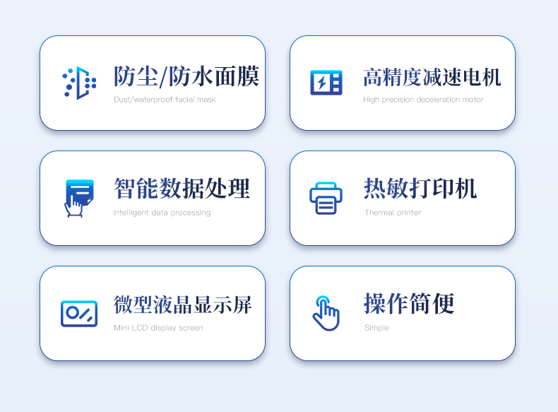 | 防塵、防水面膜、薄膜按鍵和微型液晶顯示屏 | 高精度減速電機及調(diào)速器組成的振動部分 | CPU 智能數(shù)據(jù)處理部分 | 高分辨率熱敏打印機 | 測量結(jié)果**小數(shù)后4 位 | 儀器結(jié)構(gòu)牢固,外型美觀,操作簡便 |