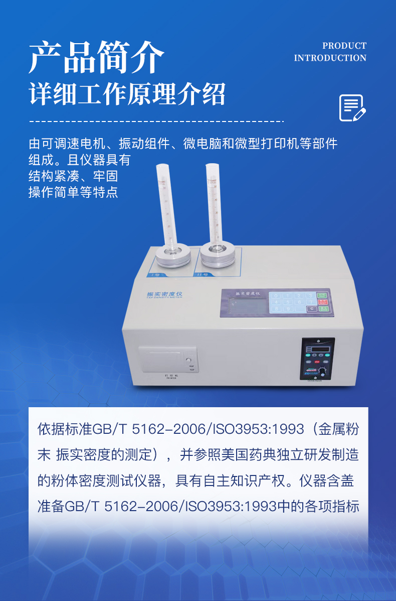 | YT-ZS2型粉體密度測試儀是由丹東市恒瑞儀器有限公司依據(jù)標(biāo)準GB/T 5162-2006/ISO3953:1993(金屬粉末 振實密度的測定),并參照美國藥典獨立研發(fā)制造的粉體密度測試儀器,具有自主知識產(chǎn)權(quán)。儀器含蓋準備GB/T 5162-2006/ISO3953:1993中的各項指標(biāo)。 | YT-ZS2型粉體密度測試儀由可調(diào)速電機、振動組件、微電腦和微型打印機等部件組成。且儀器具有結(jié)構(gòu)緊湊、牢固,操作簡單等特點。 |